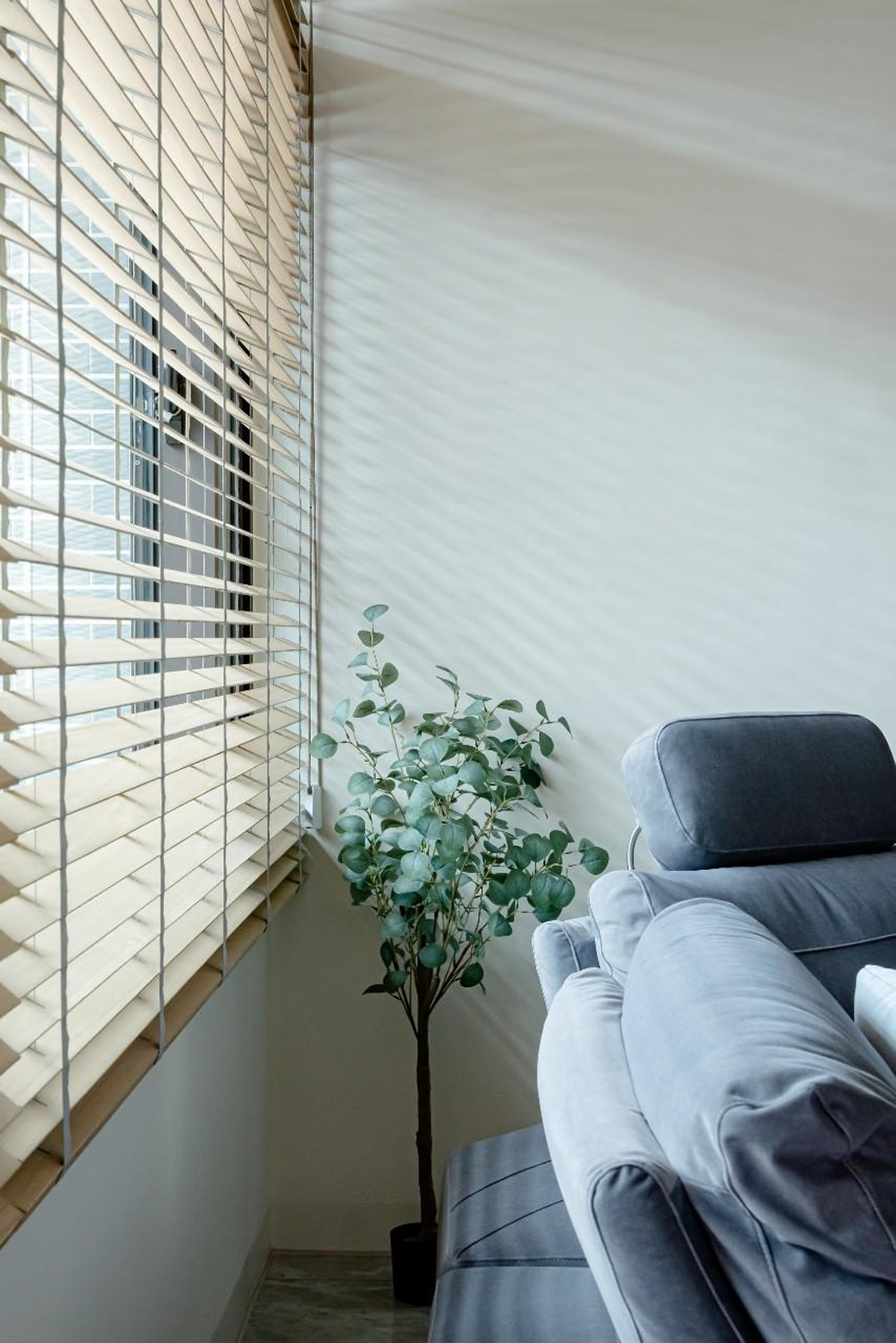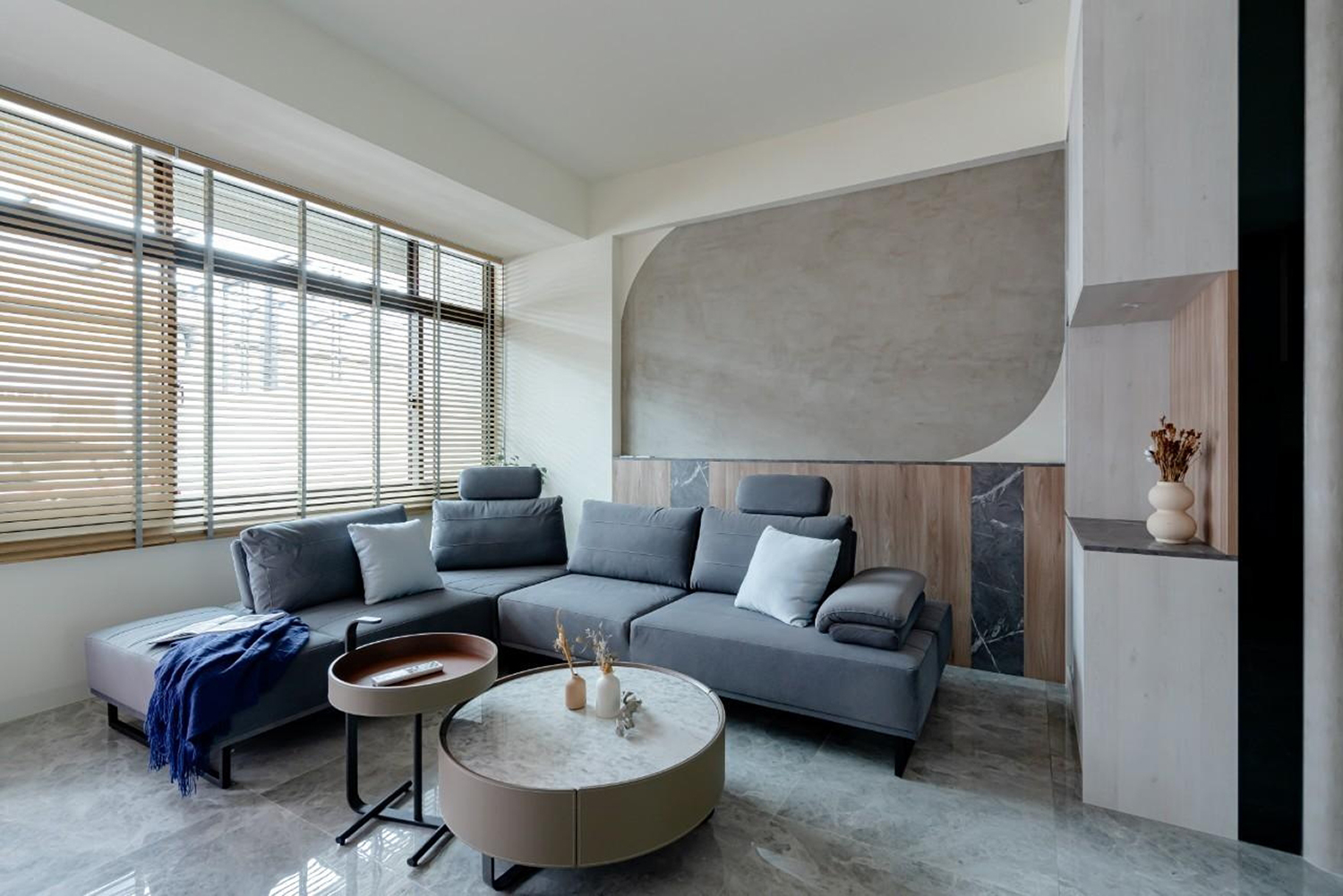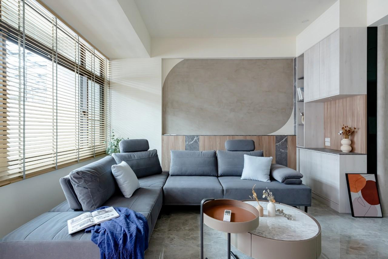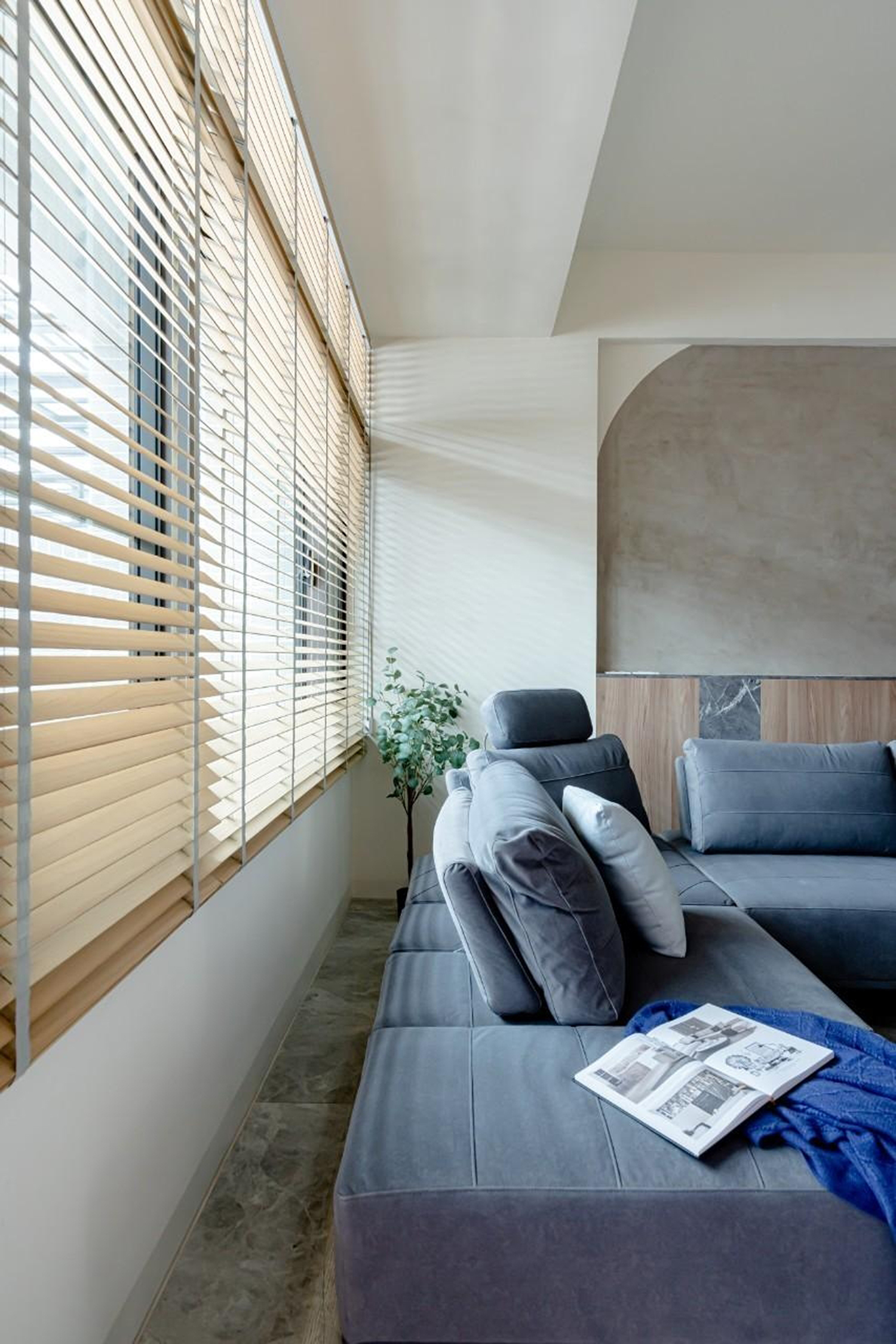 客廳牆壁深藍/大地色的搭配 加上陽光透過百葉窗照射進來讓整個客廳暖了起來