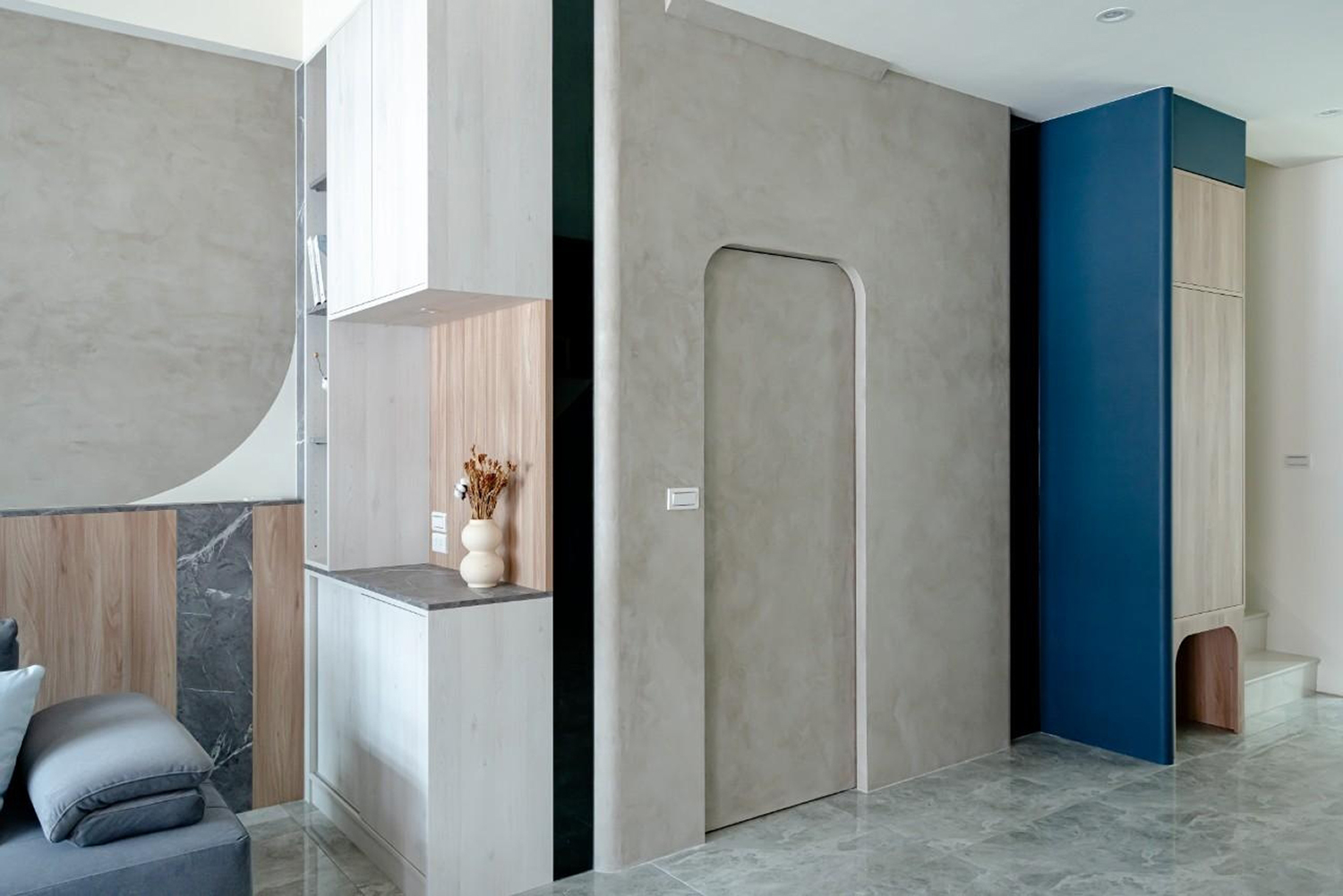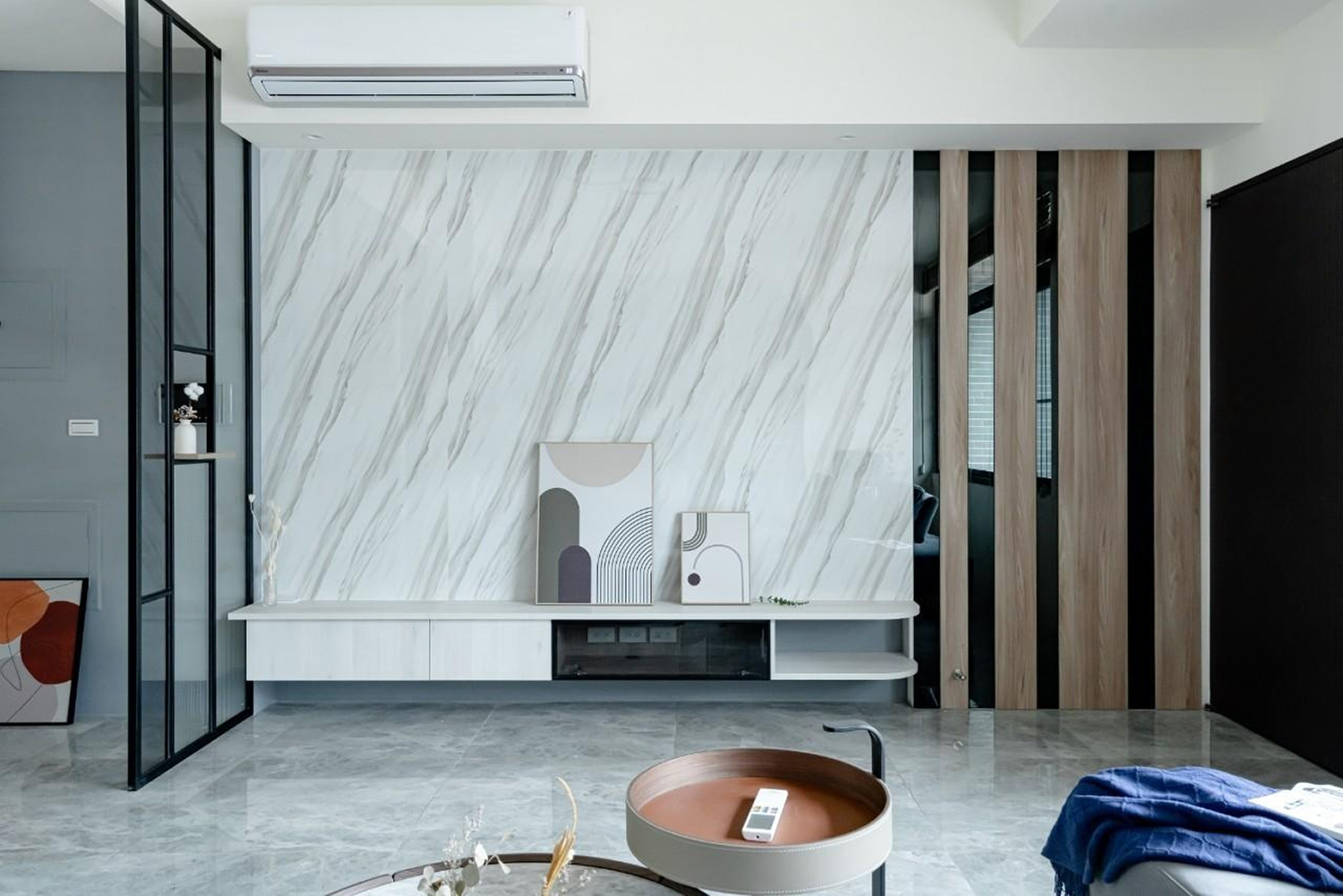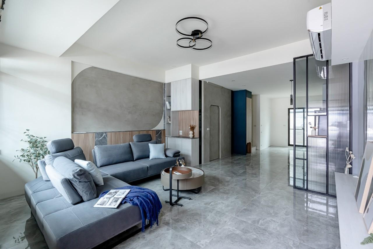 客廳牆壁深藍/大地色的搭配 加上陽光透過百葉窗照射進來讓整個客廳暖了起來