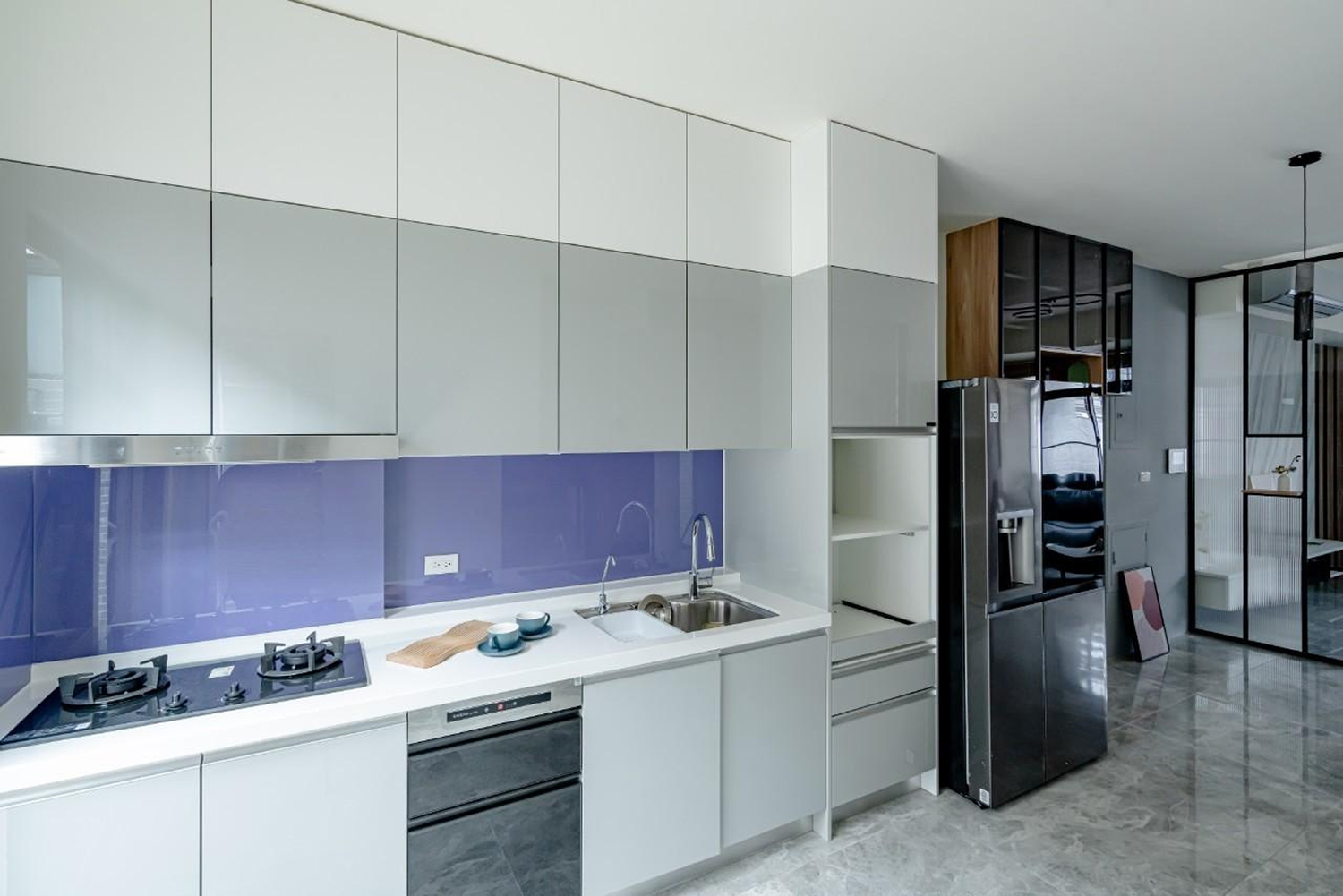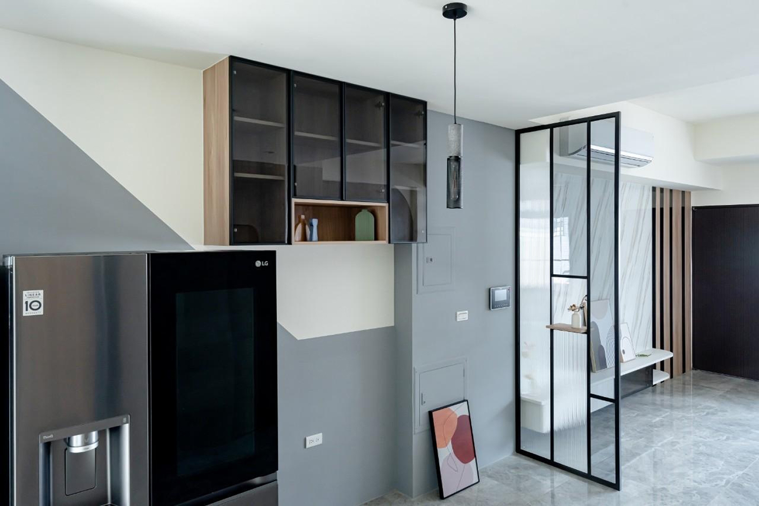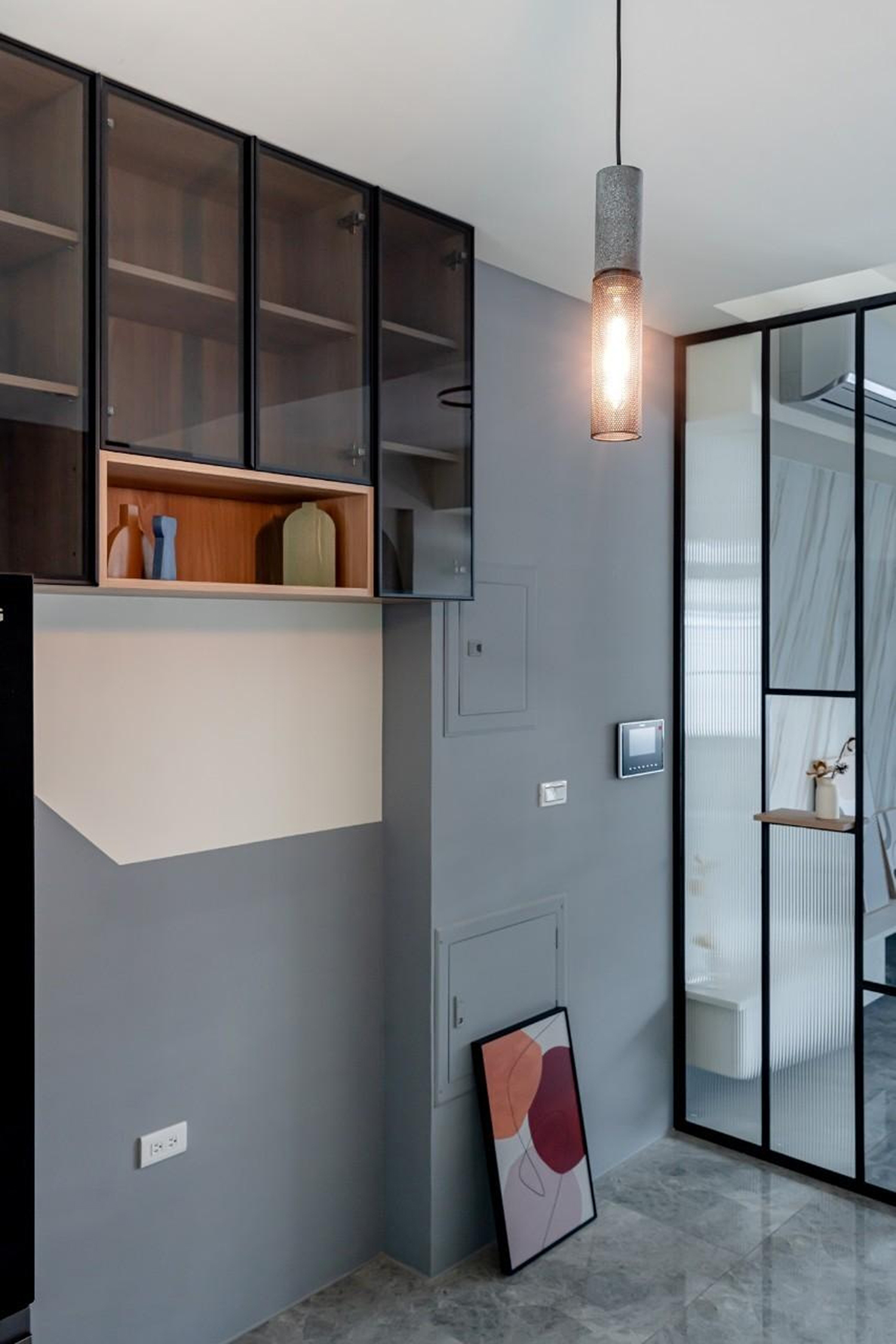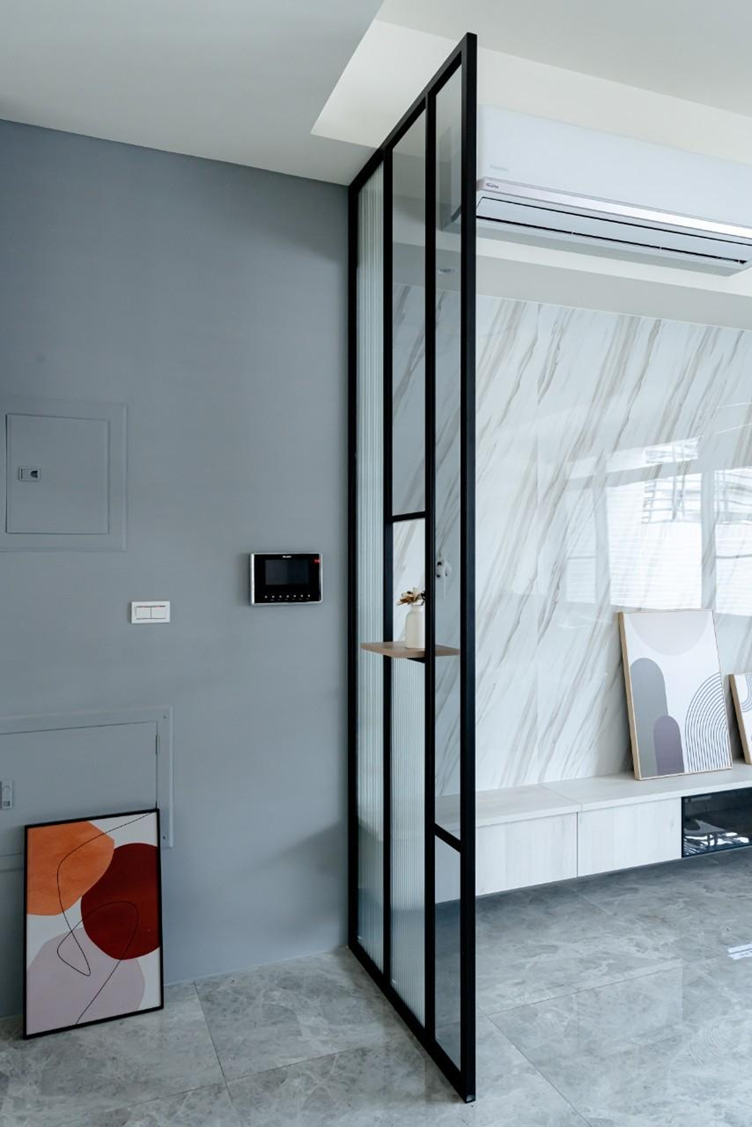 客廳牆壁深藍/大地色的搭配 加上陽光透過百葉窗照射進來讓整個客廳暖了起來